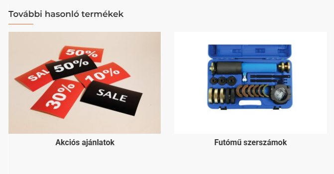 Vízszintes elrendezés: a kategória képe és neve egymás mellett jelenik meg, egy kattintható hivatkozásként. A szöveg tájékoztató jellegű: „További hasonló termékek [Kategória neve] kategóriában találhatók."