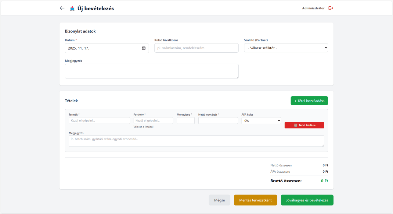 A termék kiválasztása után megadható a polchely, a mennyiség és szükség esetén az ár. A rendszer négy fő mozgástípust támogat: